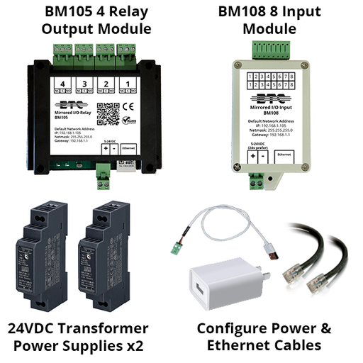 Simple remote I/O mirroring over any ethernet network with the ETC BM108 Mirrored I/O 8 channel input module and the BM105 Mirrored I/O 4 relay ou...